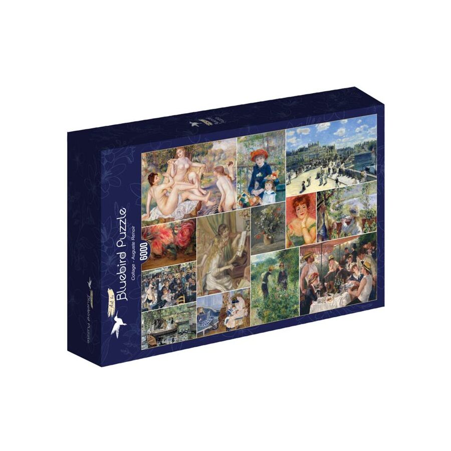 This jigsaw puzzle from the Bluebird Puzzle brand consists of 6000 pieces. The image contains a collage of works by the French Impressionist painter Auguste Renoir. The puzzle measures +/- 136 x 96 cm.
