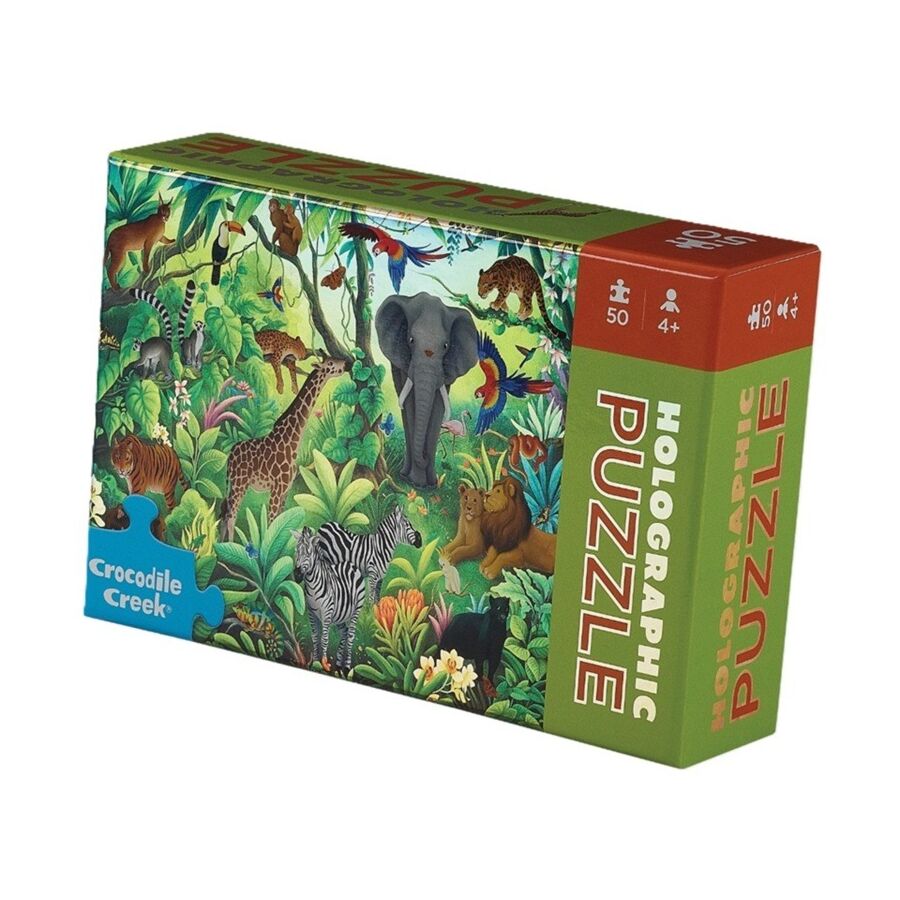 This is an animal puzzle on holographic foil. The foil gives the puzzle a beautiful sheen. In the image, you'll discover all sorts of jungle animals.