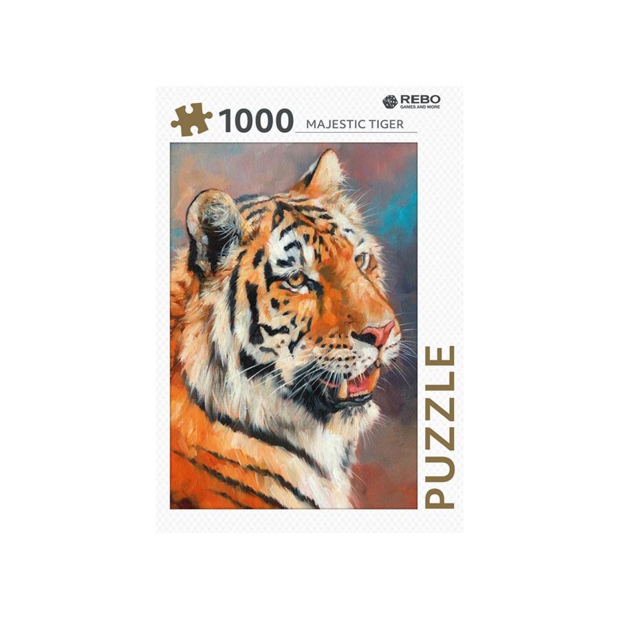 This is a jigsaw puzzle with a picture of a beautiful tiger. The puzzle consists of 1000 pieces. Dimensions of +/- 47 x 66 cm.