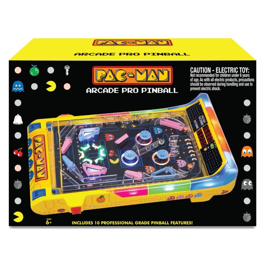 With the familiar graphics and sounds of the original PAC-MAN game, this pinball machine is sure to delight all generations of arcade enthusiasts. Just like classic pinball machines, the goal is to score as many points as possible before your ball falls down the drain three times. While the PAC-MAN music plays in the background, the electronic scoreboard keeps track of your points. This pinball machine is packed with professional features never before available on a compact home system. This includes the recessed ball launchers and the three light-up vibrating bumpers, as well as the ball tunnel that takes you into power pellet mode! The machine is packed with advanced electronics that fully harness the energy of an arcade, including bumpers that light up when the ball makes contact. Colorful LED lights surround the playfield and illuminate in different patterns as different scoring milestones are reached. This fully automated pinball machine detects when the ball falls into the drain and has flash memory to store the high score. Everyone can take turns trying to set a new record!