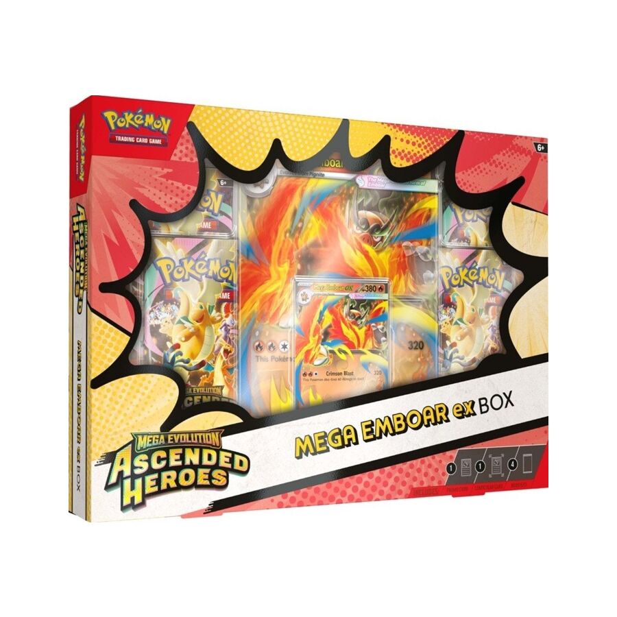 In this box, you'll find Mega Emboar ex as a playable foil promo card, along with an oversize lenticular card with dynamic artwork and four booster packs from the special Mega Evolution-Ascended Heroes expansion.