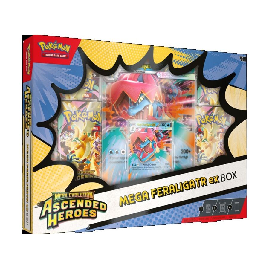 In this box, you'll find Mega Feraligatr ex as a playable foil promo card, along with an oversize lenticular card with dynamic artwork and four booster packs from the special Mega Evolution-Ascended Heroes expansion.