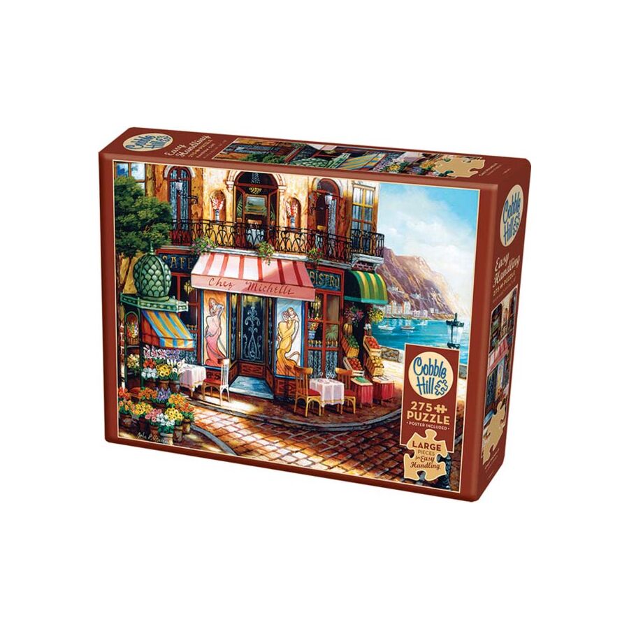 L'image de ce puzzle montre le café Chez Michelle. Le café est situé près de la mer et est entouré de fleurs et de fruits frais.
