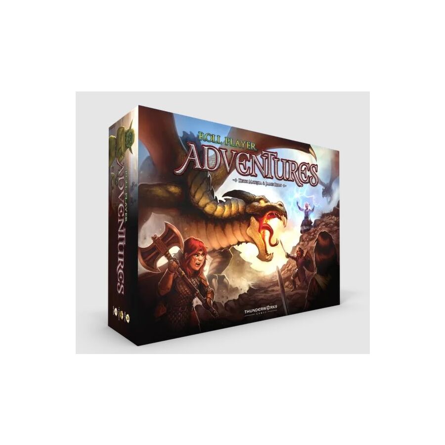 Roll Player Adventures is a co-operative storybook board game for 1-4 players set in the world of Roll Player. Players inhabit characters, face challenges, and make decisions that will change the story as they progress through eleven core adventures and a replayable side quest.