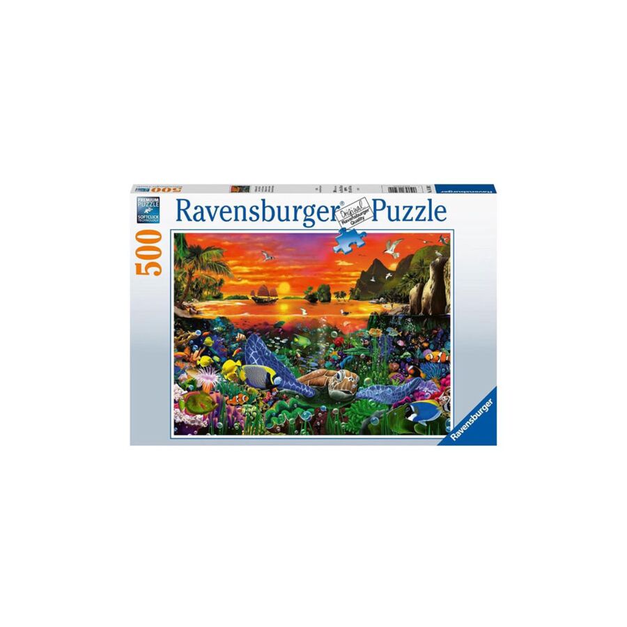 L'image de ce puzzle Ravensburger montre une tortue nageant parmi une variété d'autres animaux et plantes. La taille de ce puzzle est d'environ 49 x 36 cm. Le puzzle se compose de 500 pièces de puzzle.