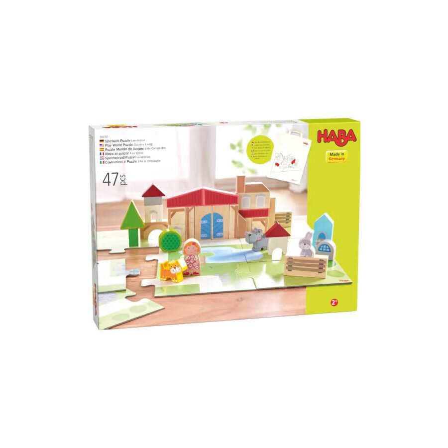Play World Puzzle Country Life contient du matériel de jeu destiné à un enfant à partir de 2 ans. L'enfant peut en faire un décor de campagne. Ensuite, il peut y jouer des histoires fantastiques avec les figurines en bois. Les blocs sont grands et faciles à saisir.