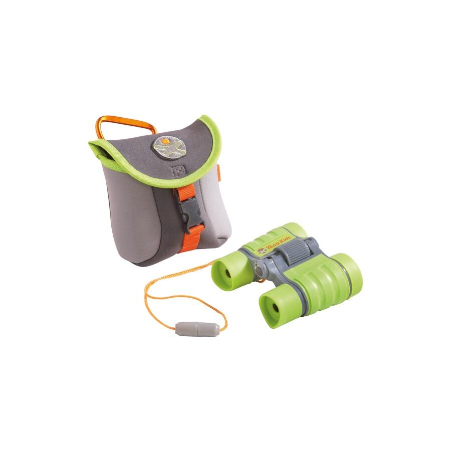 Ces jumelles Terra Kids ont un boîtier en plastique. Le pochette est en néoprène avec une fermeture à déclic + mousqueton en aluminium.