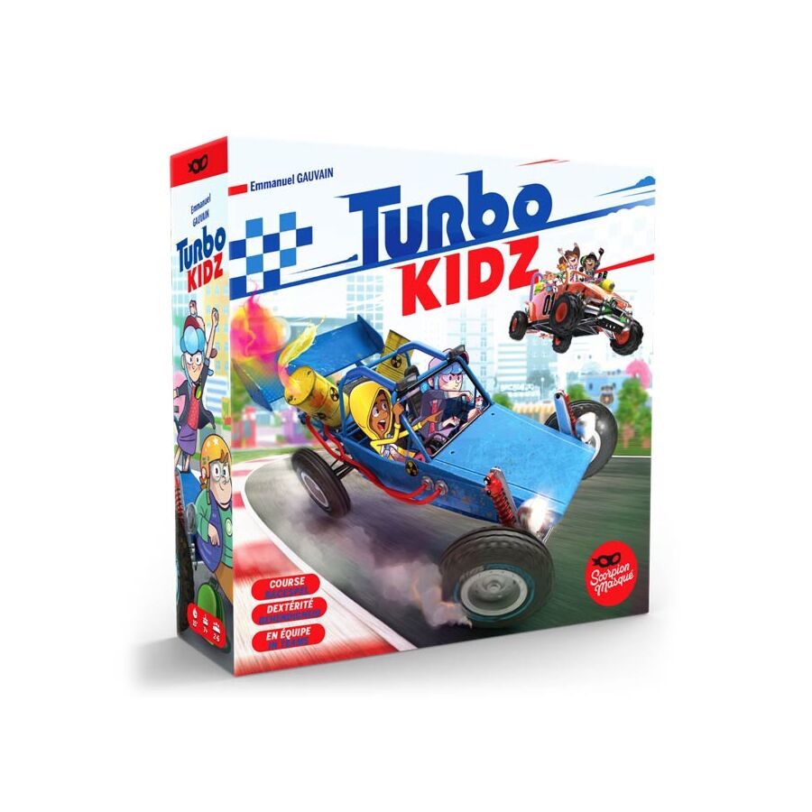 Turbo Kidz est un jeu de société dans lequel vous incarnez un pilote qui doit franchir la ligne d'arrivée. Cependant, vos yeux sont couverts. Un autre joueur est votre copilote et donne des instructions avec sa voix. Il utilise également votre pouce comme joystick pour que vous ne sortiez pas de la piste.