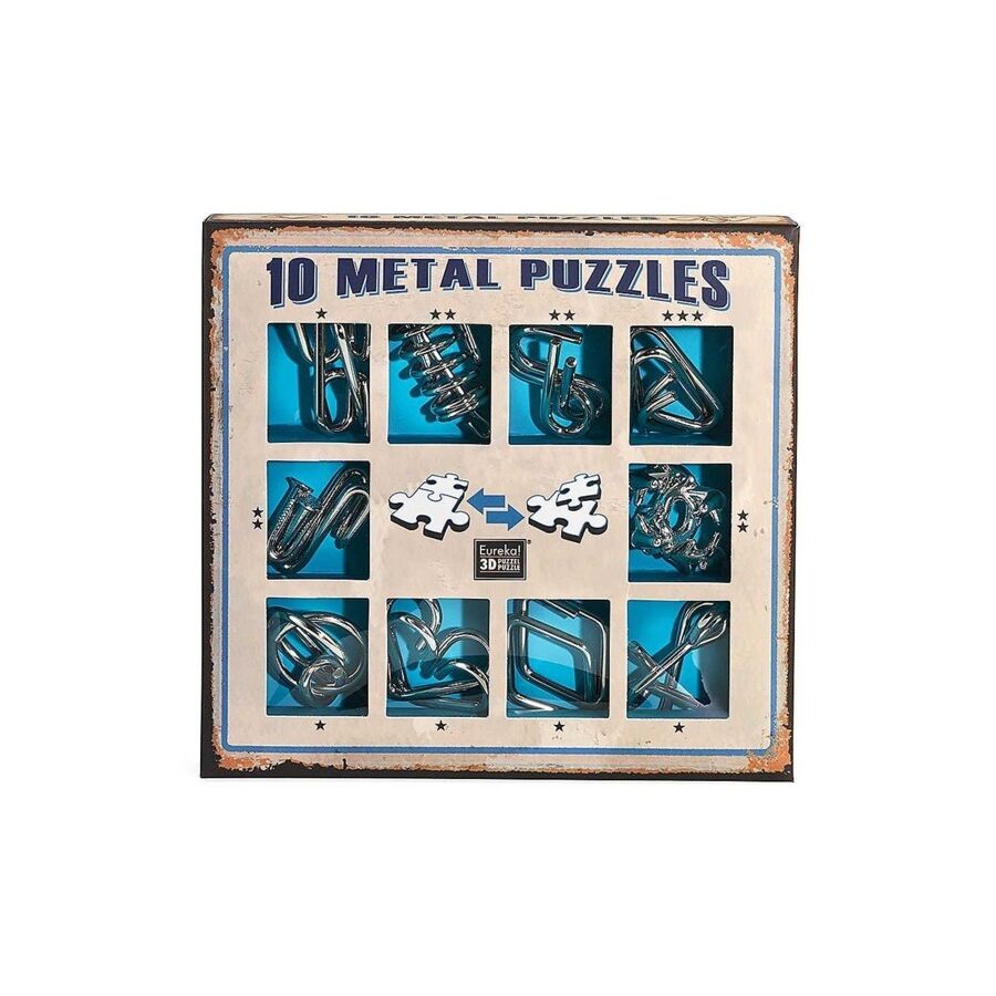 Dit is een set met 10 metalen puzzeltjes zoals o.a. een spiraalpuzzel en een spijkerpuzzel. Scheid bij iedere puzzel de onderdelen en zet ze daarna weer in elkaar.