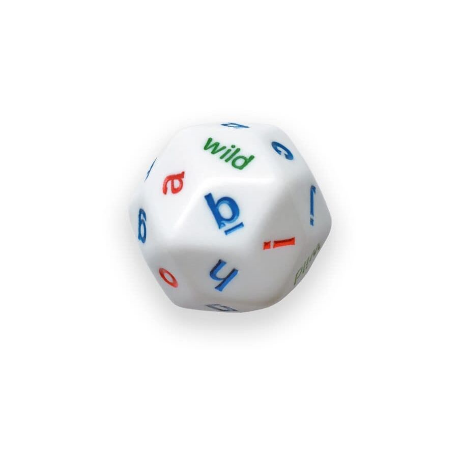 Dit is een witte dobbelsteen met dertig vlakken. Je vindt er alle letters van het alfabet op terug. Daarnaast zijn er nog vier vlakken met 'wild' op. Deze dienen als joker.