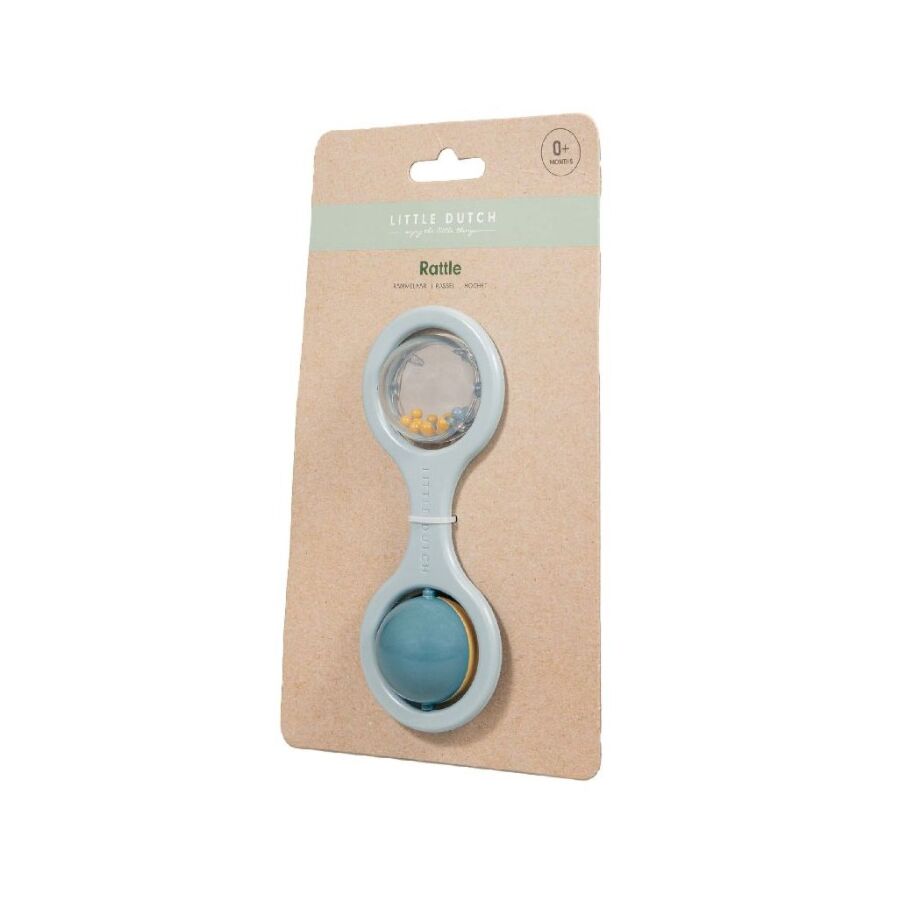 Dit is een blauwe bal rammelaar. De baby kan de rammelaar gemakkelijk vastpakken. Bij het schudden, draaien de twee grote ballen en hoor je kleine balletjes binnenin bewegen.