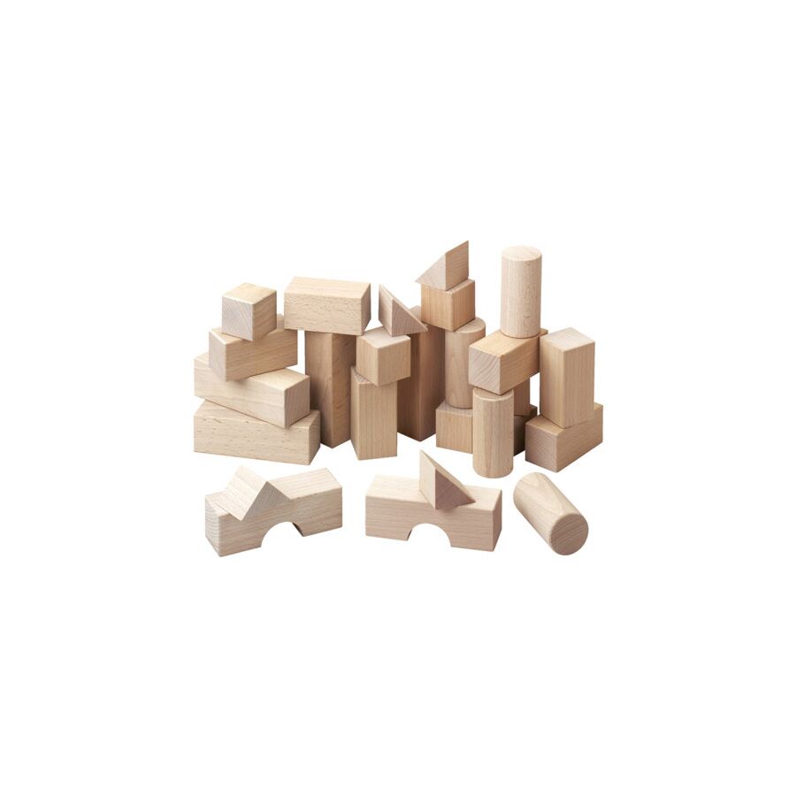 Dit basispakket bouwblokken van HABA bevat 6 kubussen, 10 balken, 4 driehoeken, 2 bruggen, 4 ronde zuilen.