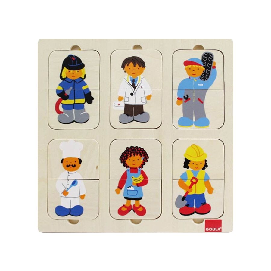 Dit is een leerrijke houten puzzel over zes verschillende beroepen.