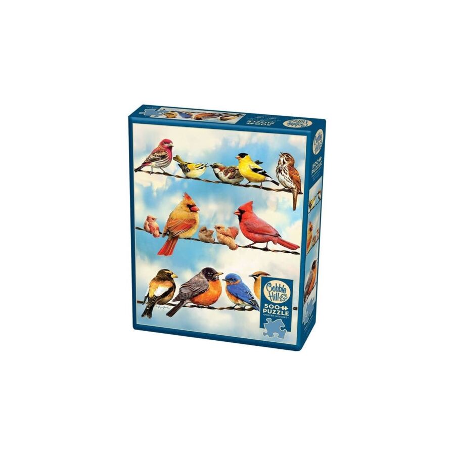 Op de afbeelding van de Cobble Hill puzzel Birds on a Wire zie je 14 vogels bij elkaar op een draad zitten. Het zijn mooie kleurcontrasten.