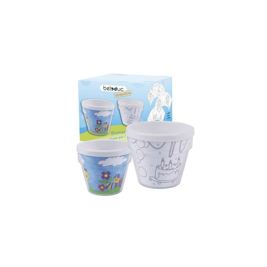 De bloempot is gemaakt van kunststof. Er zitten verschillende tekeningetjes bij die je in de pot kan stoppen om hem zelf mooi te versieren.