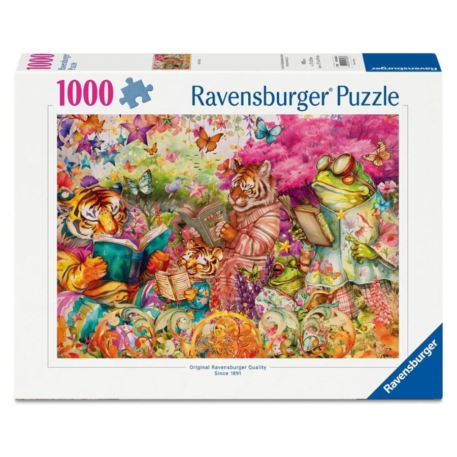 Stap binnen in een betoverende wereld waar dieren en verhalen samenkomen met de “Book Club” puzzel van Ravensburger. Deze unieke puzzel van 1000 stukjes toont een fantasierijke scène waarin tijgers en een pad rustig zitten te lezen in een warme, dromerige omgeving.