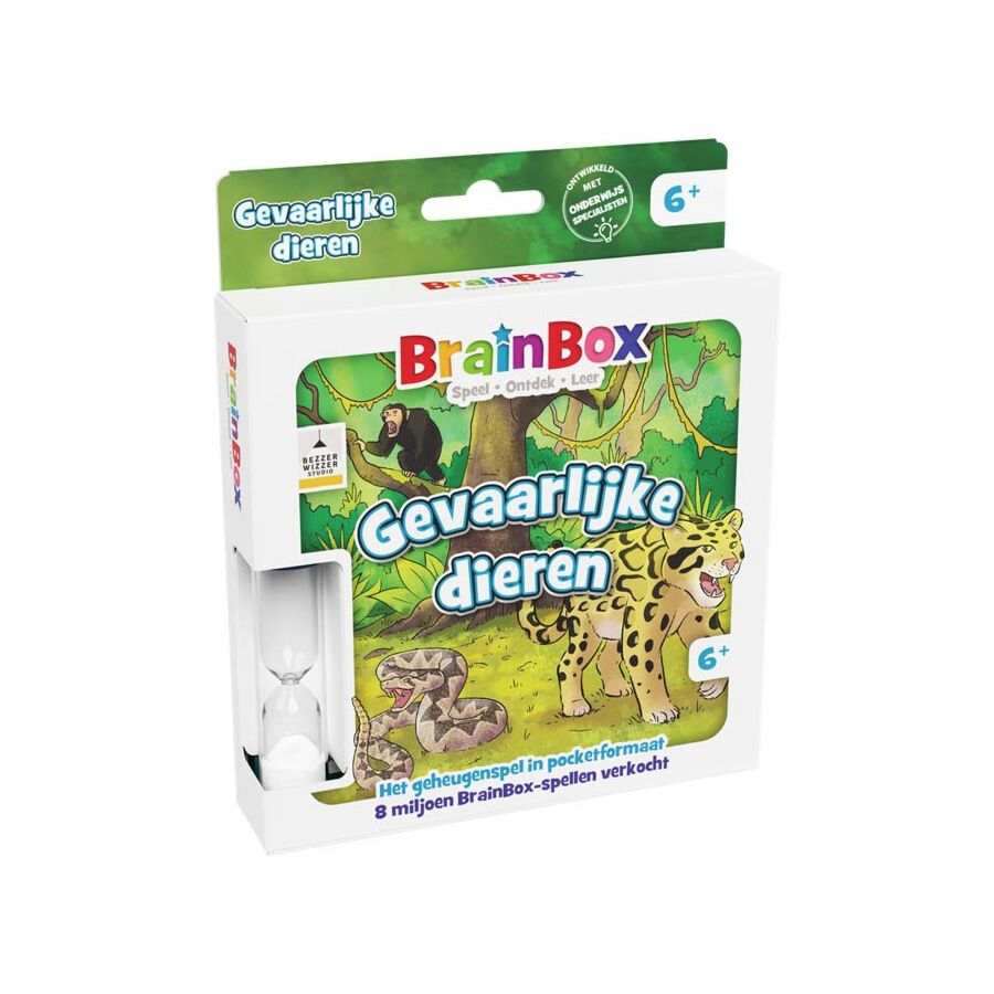 Dit pocket Brainbox spel is een visueel familiespel boordevol weetjes en vragen om het geheugen te testen. Zo zijn er bijvoorbeeld vragen over de ijsbeer, de Bengaalse tijger, de Vijfstreepschorpioen, de Roodrugspin en de Tijgerhaai.