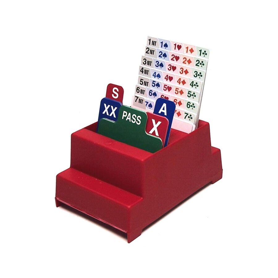 Dit is een set die bestaat uit vier rode Bridge biedboxen met geplastificeerde biedkaarten.