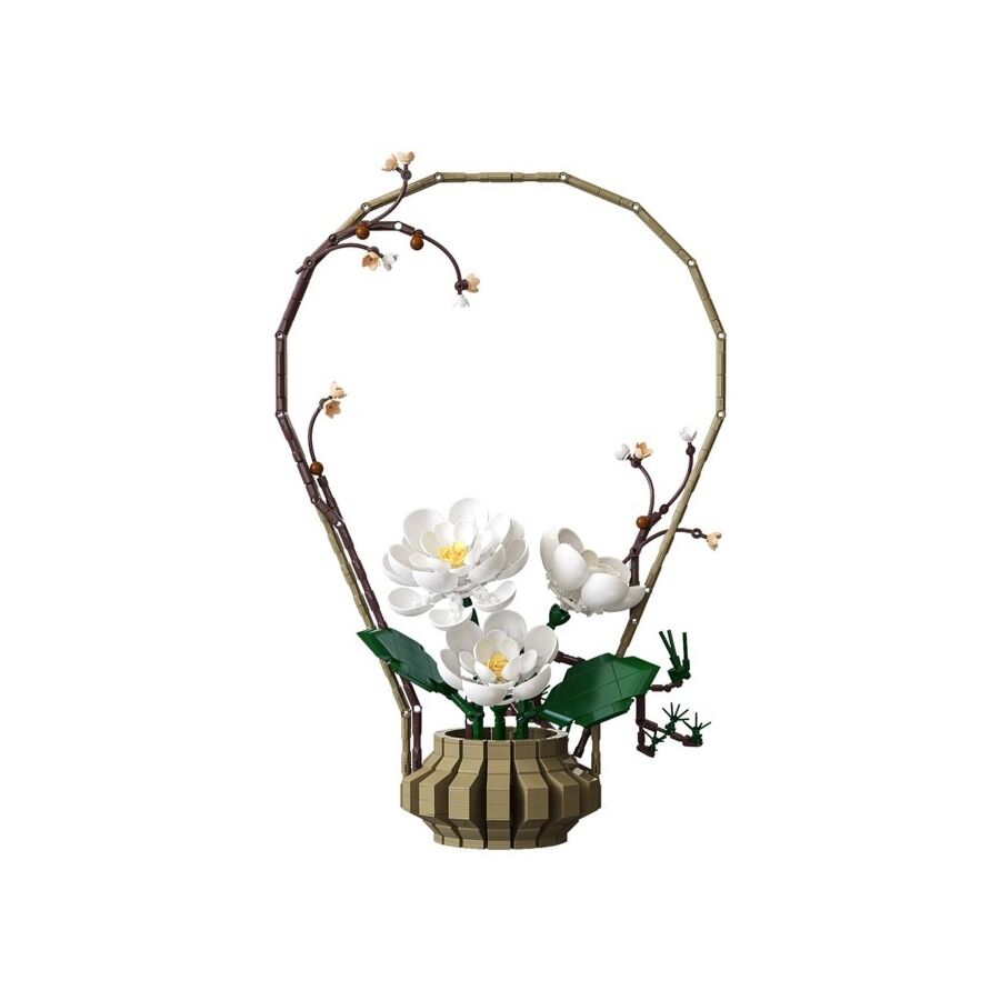 Met maar liefst 990 bouwstenen bouw je stap voor stap een prachtige bloemencompositie geïnspireerd door de stilte en zuiverheid van de winter. De witte bloemen, gecombineerd met groene en bruine stelen, groeien uit een decoratieve pot en vormen samen een harmonieuze, moderne creatie – volledig opgebouwd uit bricks.