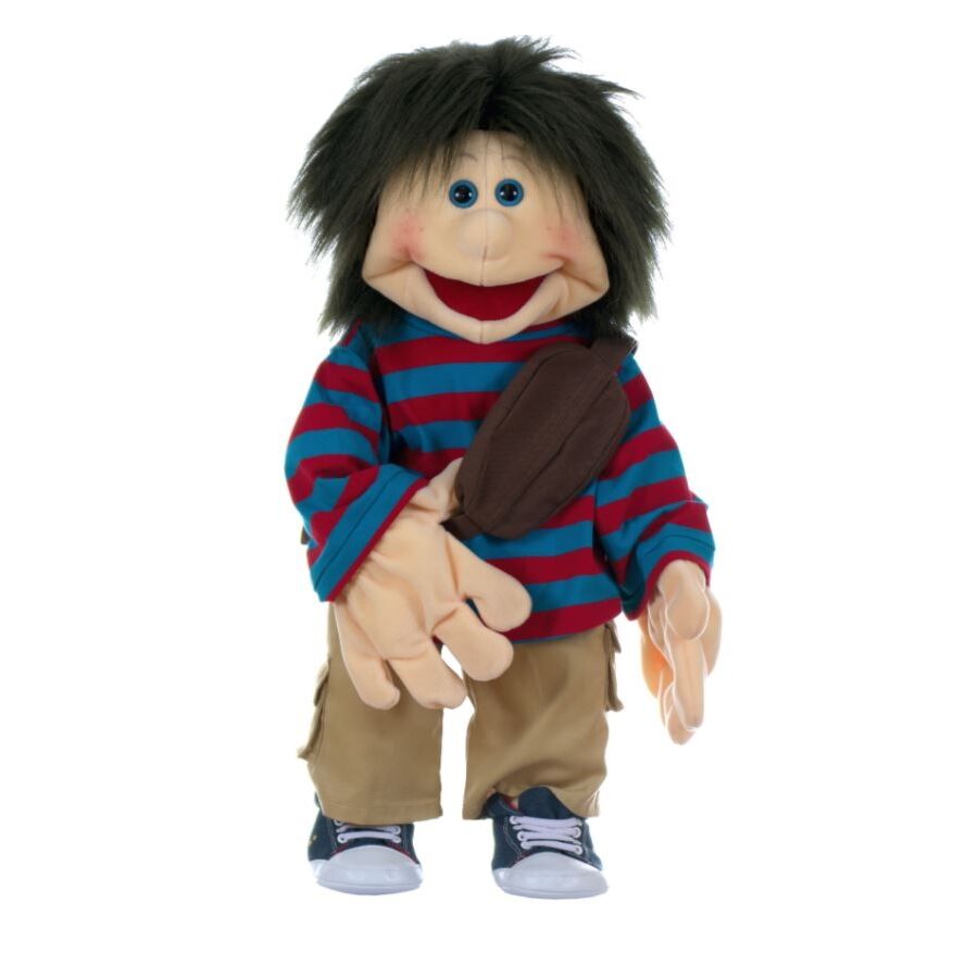 Chrischi is een Living Puppet van 65cm met een schoudertas. Hij houdt van lettersoep, maar enkel met A's en B's. De trui, de broek en de schoenen van de handpop kunnen uitgedaan worden.