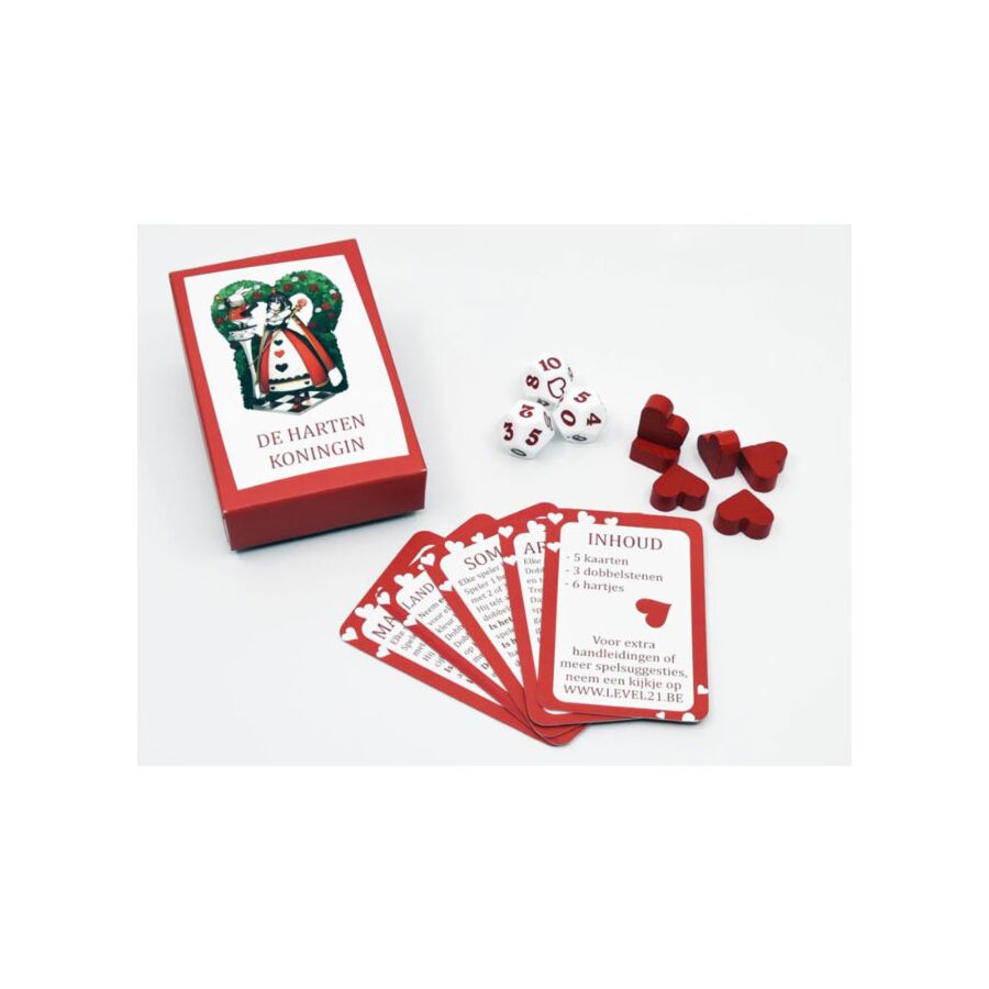Het spelletje De Hartenkoningin bevat 3 dobbelstenen met op één zijde telkens een hartje en op de andere zijdes een getal van 0-10. Verder zitten er nog 5 kaartjes in het doosje en 6 houten hartjes. De hartjes stellen het aantal levens voor tijdens de spelletjes. Door een hartje te dobbelen, krijg je weer een leven bij. Dit werkt motiverend.