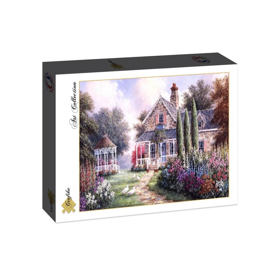 Op de puzzel Emira's Cottage zie je een huisje dat omgeven is door prachtige bloemen en witte eenden. De afbeelding is erg rustgevend. Het is een ontwerp van Dennis Lewan.