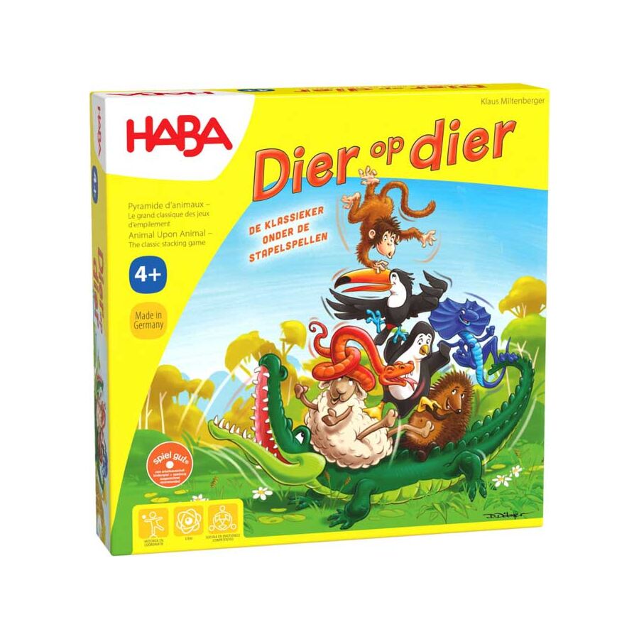 Dier op Dier is een wankel stapelspel met 29 houten dieren.