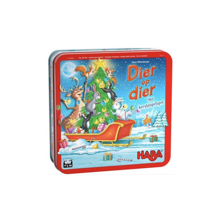 Bij het spel Dier op Dier Kerststapelspel vormen de dieren een kerstpiramide die steeds hoger wordt. De spelers stapelen elanden, pinguïns, eekhoorns en sneeuwhazen op elkaar. Naast dieren, worden er ook dennenbomen, sterren en sleeën gestapeld. Wie als eerst al zijn figuren geplaatst heeft, wint het spel!