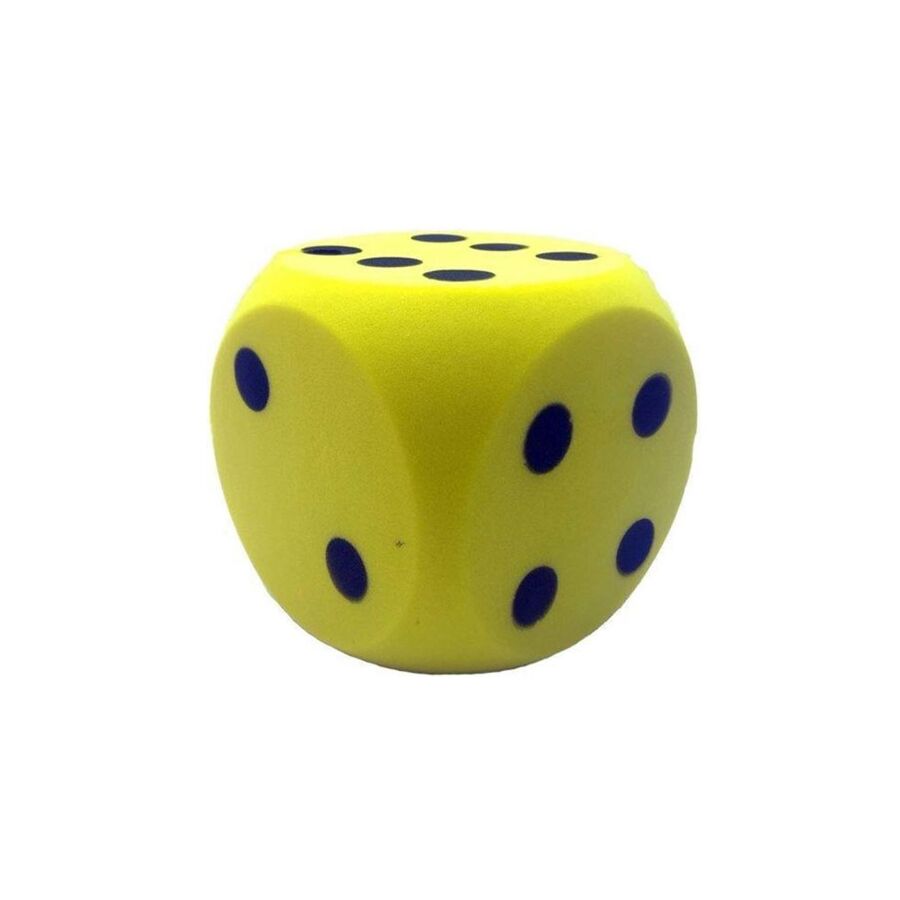 Dit is een grote dobbelsteen van schuimrubber. De zijdes van de dobbelsteen zijn 15 cm. Het is een gele dobbelsteen met zwarte ogen.