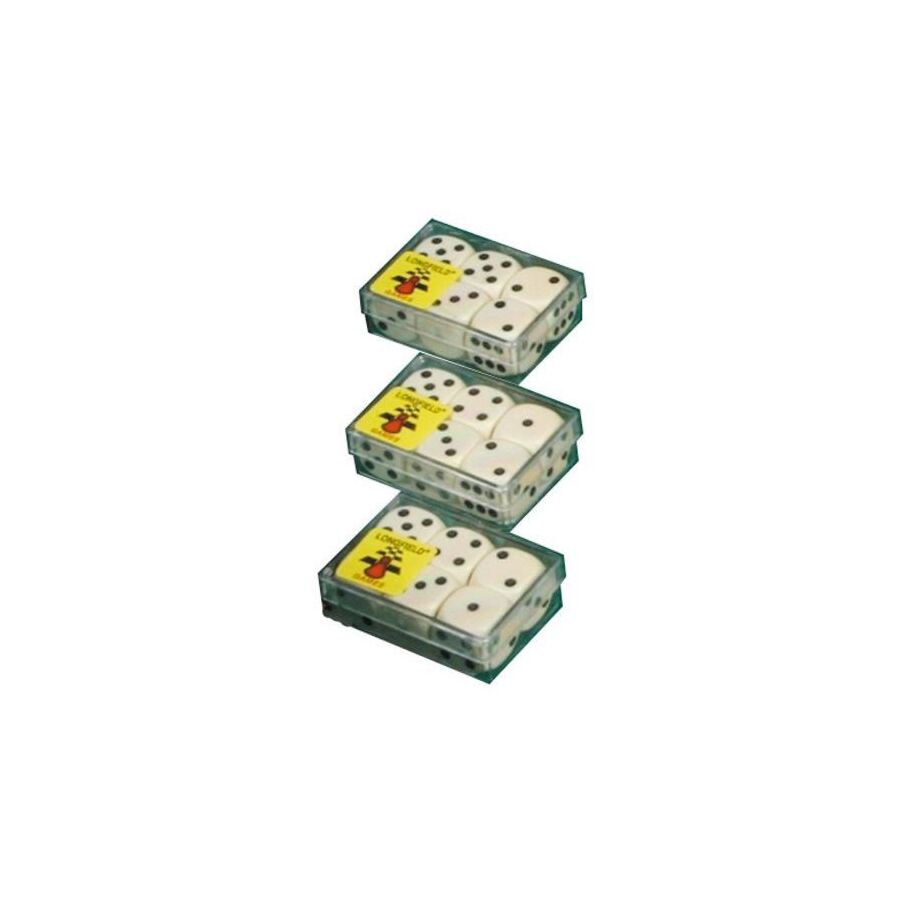 Dit is een palstieken doosje met 6 crème-witte dobbelstenen van 16mm. De dobbelstenen hebben een standaard formaat en kunnen bij veel verschillende spelletjes gebruikt worden.