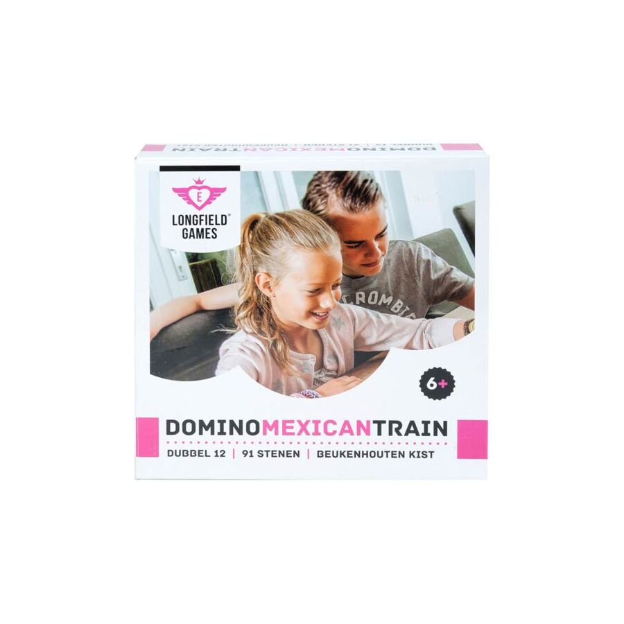 Dit Domino Mexican Train spel bevat 91 stenen met gekleurde ogen, gekleurde treinen en een centrumstuk. De stenen hebben een afmeting van 25 x 9 x 9 mm.