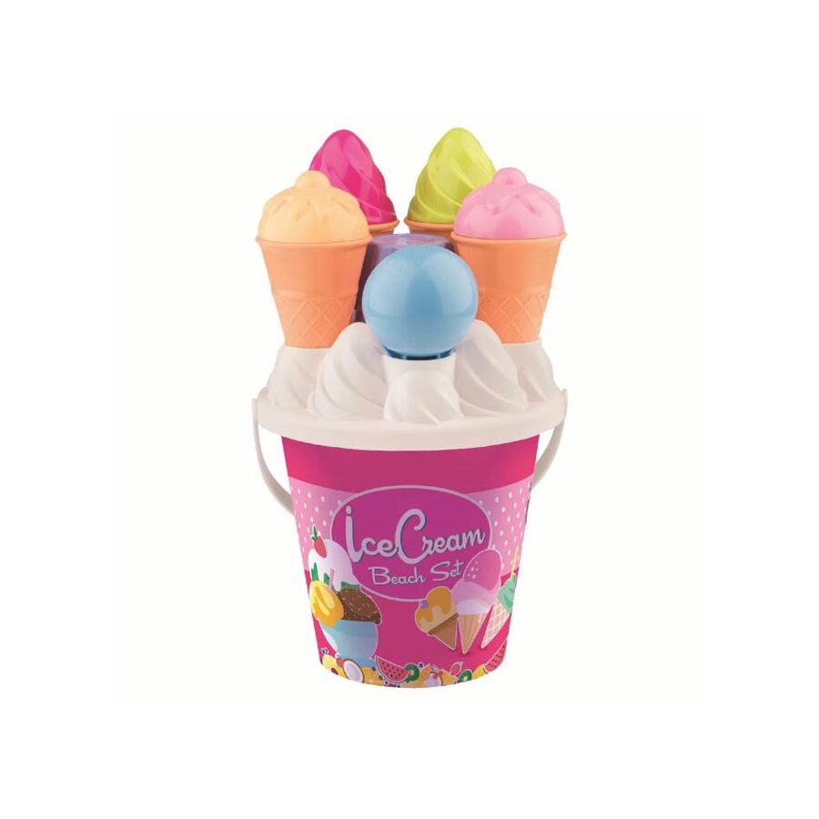 Dit is een roze speelgoed emmerset waarmee je zelf ijsjes kan maken in de zandbak. Bevat 4 speelgoed ijshoorntjes, een lepel, zandvormpjes en een zeef.