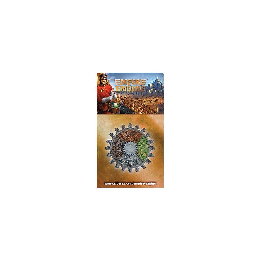 In the game Empire Engine, players take on the role of a mighty empire, powered by rotating gears. During the game, players simultaneously choose actions to attack, defend, salvage, export, or collect resources (goods for export, soldiers to attack your opponents and inventions to score points). Players use their gears to rotate their engines, and in each round perform the actions on the top edges of their engines.