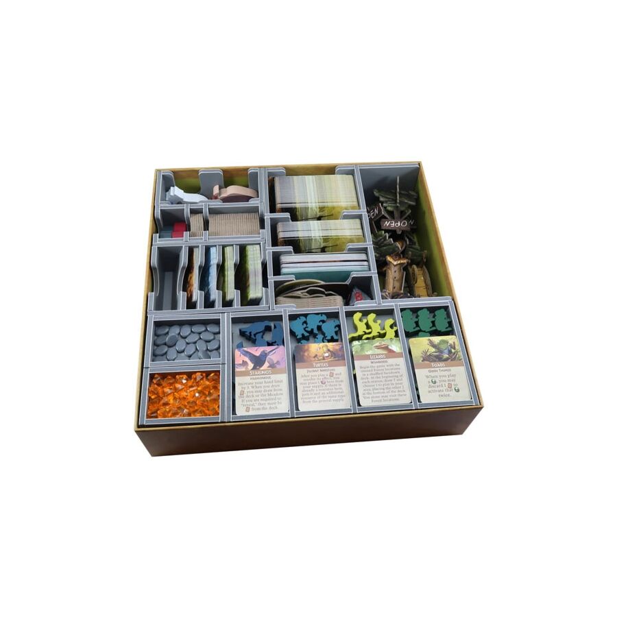 The design provides both efficient storage and improved game play. Many of the trays can be utilised during the game, and they greatly aid set-up and clear-away times. There is space for all cards to be sleeved.Note that the insert fills the game box, and it is intended that the game boards, scorepad, Ever Tree and other large tiles are stored in one of the expansion boxes. The insert has four large flat trays for storing the critters, and in one slot the plastic saddles. The sleeved player power cards can either be stored in the separate small card tray, or preferably stored together with the relevant critter type. The other trays store the game components as shown. Each resource and tile type has it's own dedicated slot, and the trays are designed to be placed on top of the board during game play. All card trays have space for sleeved cards. The insert includes one large tray which has no base and is designed to remain in the game box. This stores the large cards, event & garland award tiles, the die, and has a large open slot for the signs & 3D wonders standees.