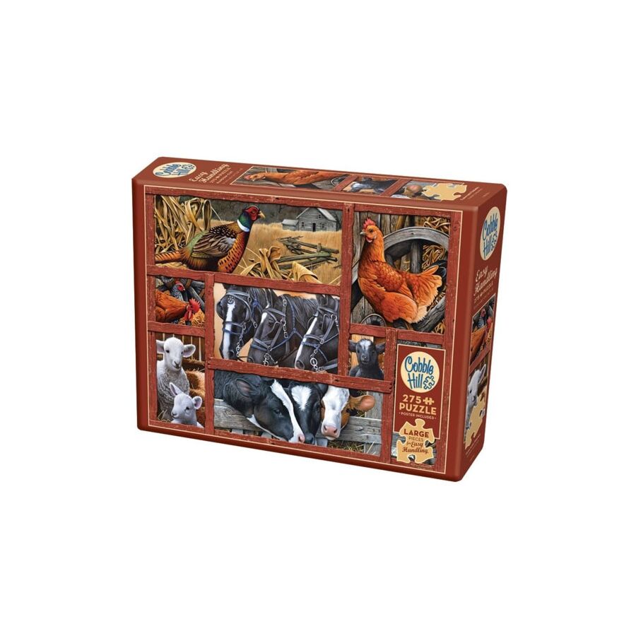 De Cobble Hill puzzel Farmyard Friends bevat 8 portretten met dieren die je op het boerderijerf vindt: een fazant, kippen, koeien, schapen, paarden en een lief vogeltje.