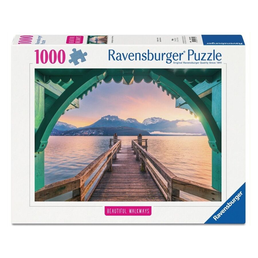 Ontsnap naar de serene natuur van de Franse Alpen met de “Footbridge at Lac d’Annecy” puzzel van Ravensburger. Deze sfeervolle puzzel van 1000 stukjes toont een charmant houten bruggetje dat over het heldere water van het meer leidt, omringd door weelderig groen en een adembenemend berglandschap.