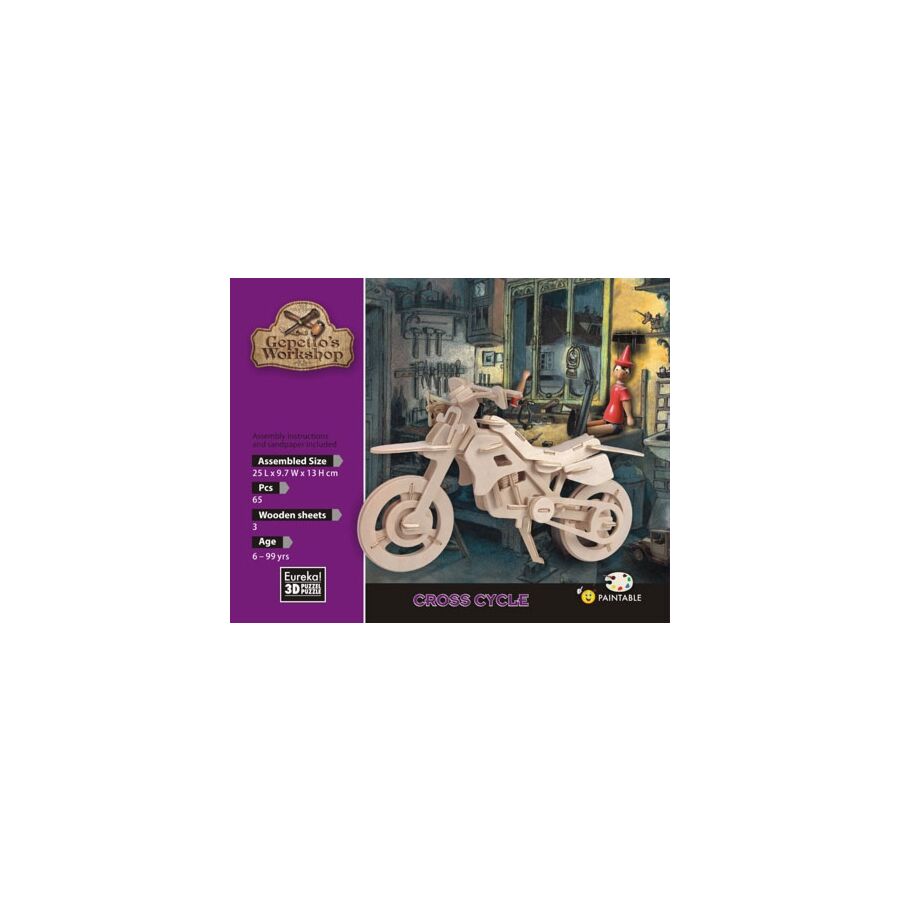 Dit is een 3d-puzzel uit de reeks 'Gepetto's Workshop' van Eureka van een Cross Cycle. De puzzel bestaat uit 3 houten bladen waar de stukjes uitgeduwd moeten worden om ze daarna in elkaar te passen volgens plan. De 3D puzzel Gepetto's Cross Cycle meet ongeveer 25 x 9,7 x 13 cm en bestaat uit 65 stukken. Indien gewenst, kunnen de puzzelstukjes geschilderd worden.