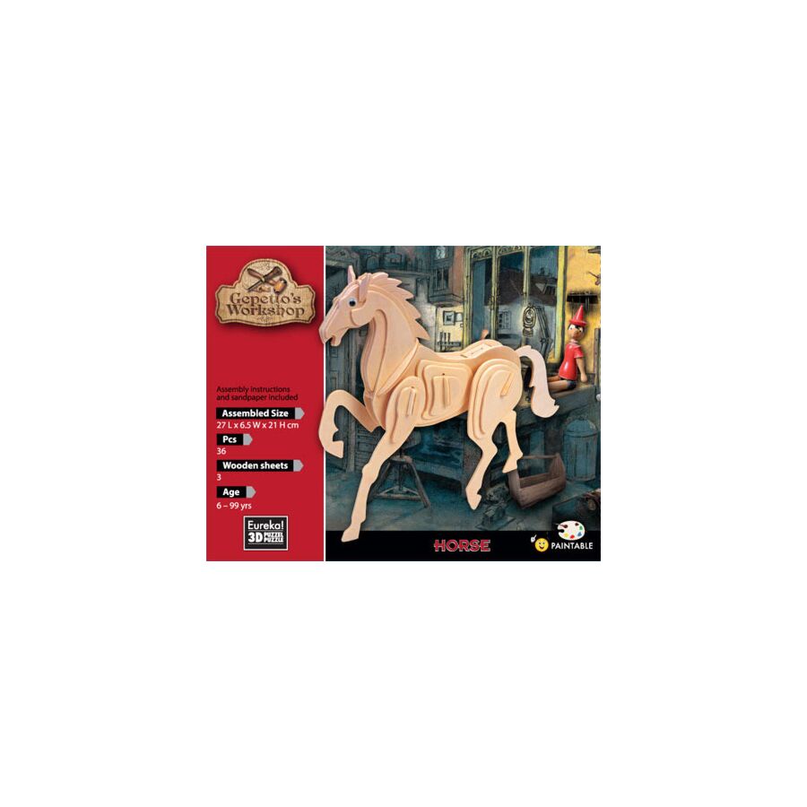 Dit paard is een 3d-puzzel uit de reeks 'Gepetto's Workshop' van Eureka. De puzzel bestaat uit 3 houten bladen waar de stukjes voorzichtig uitgeduwd kunnen worden. Deze 3d-puzzel van een paard meet ongeveer 27 x 6,5 x 21 cm. Deze 3d puzzel kan makkelijk geschilderd worden.
