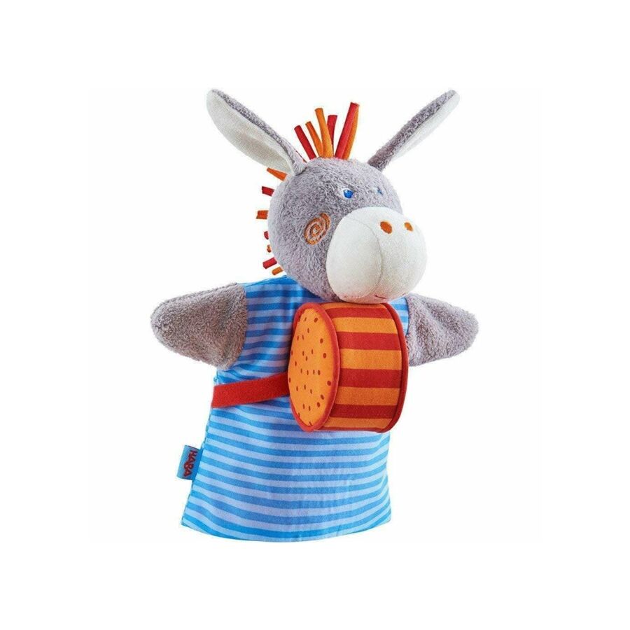 Dit is een mooie handpop van een muzikale ezel. In de trommel van de ezel zit een ratel. Zo wordt al spelend de waarneming van geluiden bevorderd.
