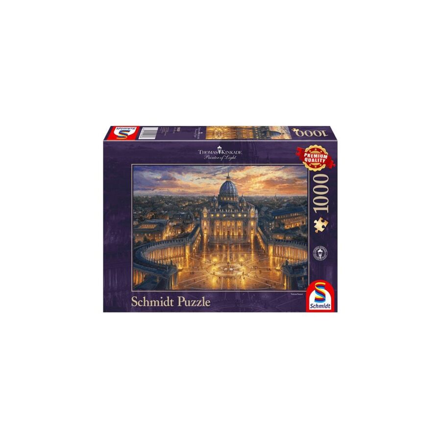 Deze puzzel bevat een afbeelding van de kunstenaar Thomas Kinkade, ook wel de schilder van het licht genoemd. Je ziet het Vaticaan in een gouden avondschemering. De puzzel bestaat uit 1000 puzzelstukken.