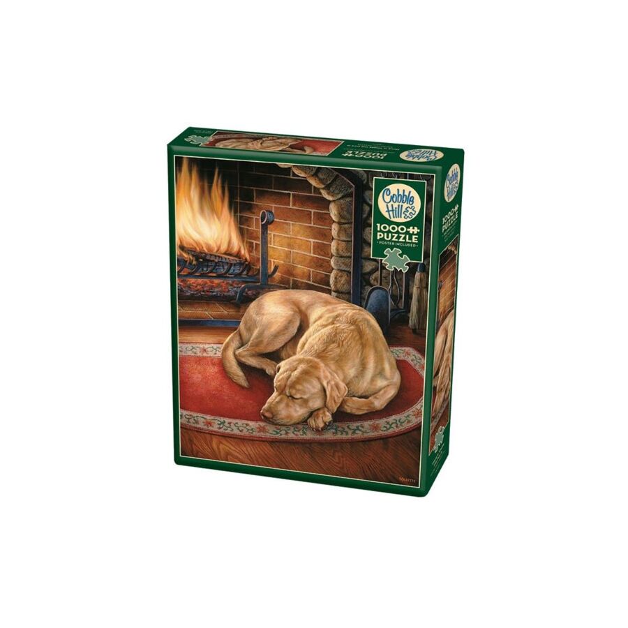 Dit is een puzzel speciaal voor hondenliefhebbers. Op de afbeeling van Home is where the Dog is zie je een hond die een dutje doet op een mat voor de haard.