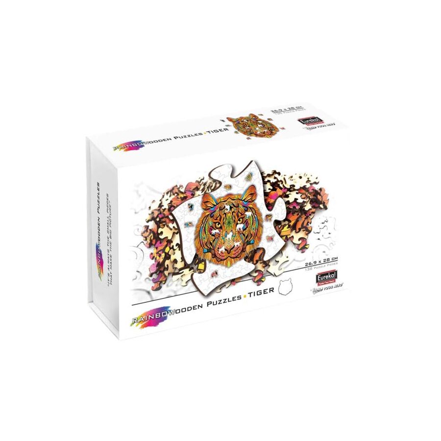 Dit is een houten puzzel in de vorm van een tijger. De puzzel bestaat uit 138 puzzelstukjes en is geschikt voor de leeftijd van 7 jaar of ouder.