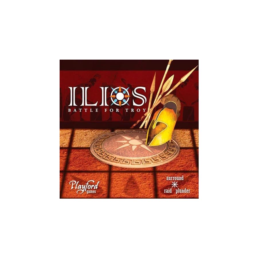 In the game Ilios: Battle for Troy, 2 to 4 players take turns deploying warrior tiles with white rays representing spears and swords and their directions of attack. When a player raids a warrior tile, they place a disk of their color to occupy it. Warrior tiles are occupied by different players throughout the game until a tile is completely surrounded. It is then removed from the board, and added to the plunder of the player occupying it. Multiple tiles may be surrounded on one play, and surrounded tiles may be occupied by other players. This means your opponents can plunder on your turn.