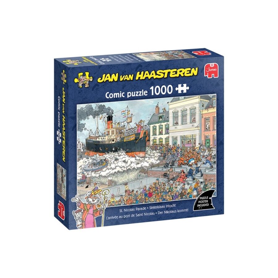 Dit is een legpuzzel over de Sinterklaasintocht. De heilige man arriveert per stoomboot, precies op het moment dat een enorme golf de haven overspoelt. Het gevolg? Complete chaos! Precies zoals je verwacht in een Jan van Haasteren puzzel.