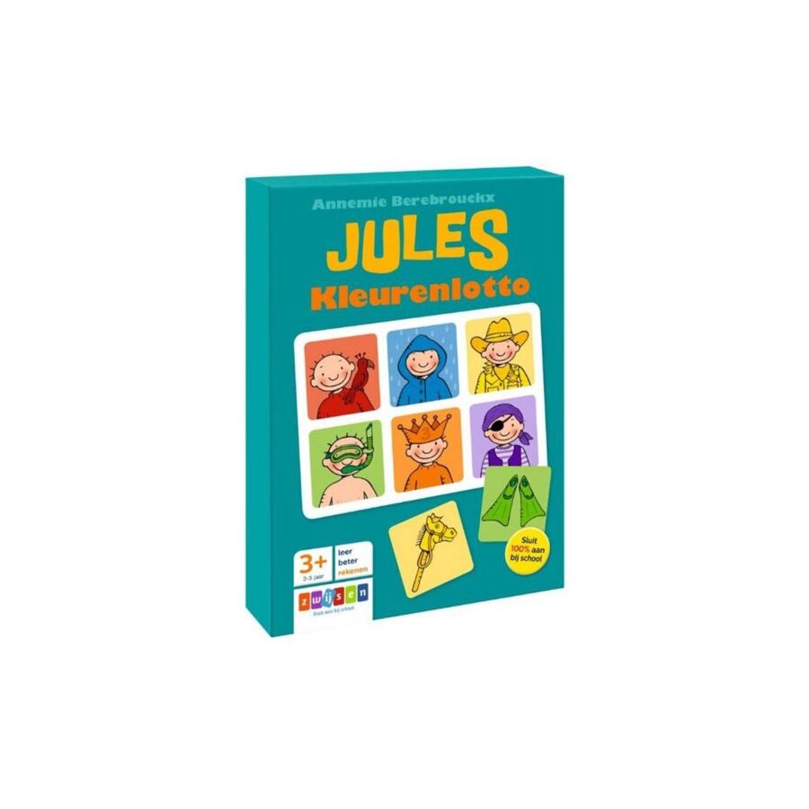 Bij het Jules Lottospel gaan kinderen kaartjes met de juiste kleur en het juiste thema verzamelen. Spelenderwijs leren kinderen kleuren en voorwerpen herkennen die bij elkaar horen. Wie heeft de oranje taart die hoort bij de oranje jarige Jules? En wie heeft de gele laars die hoort bij de gele cowboy Jules?