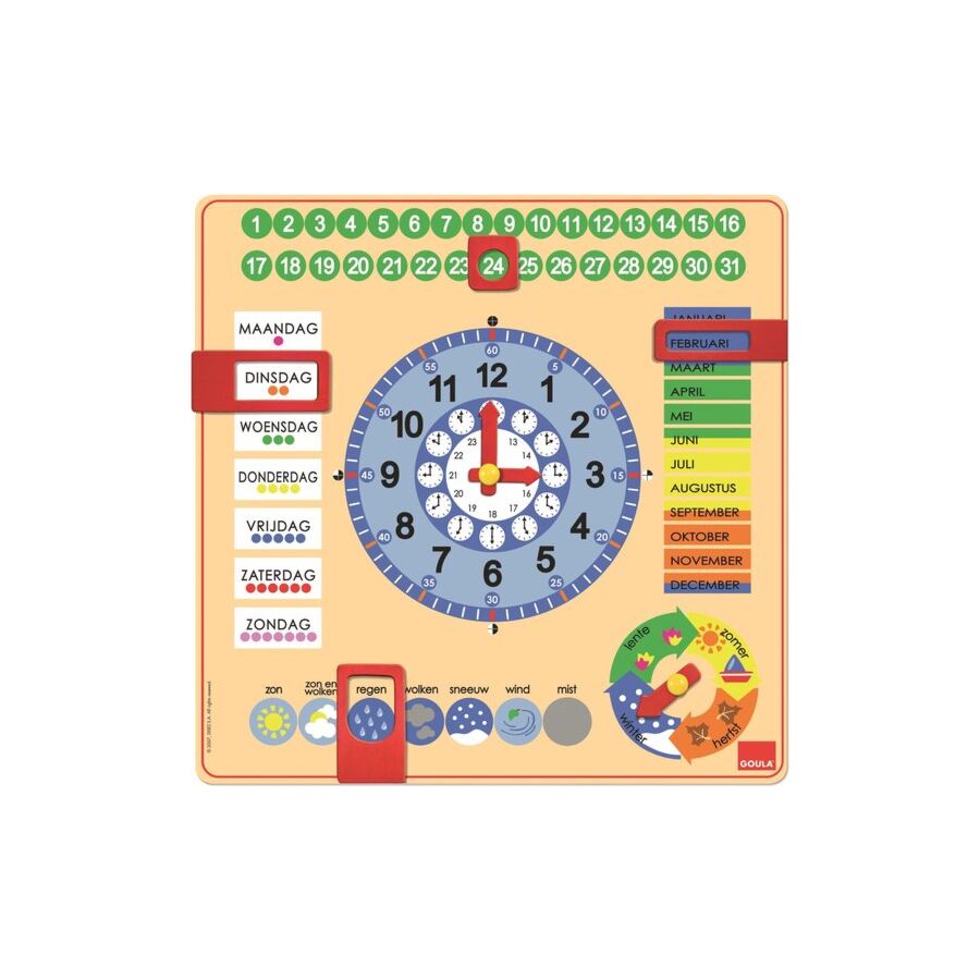 Op de klok kan je het uur, de dag van de week, de maand, het weer en het seizoen aangeven. Met gekleurde houten knopen en draaibare wijzers waarmee het kind de tijd zelf kan aanduiden.