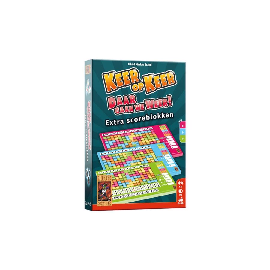 Dit zijn drie losse scorebloks (roos, blauw en groen) voor het dobbelspel Keer op Keer. Op iedere scoreblok staan de gekleurde vakjes op een andere plaats. Je beleeft dus nog uren spelplezier met deze aanvulling!