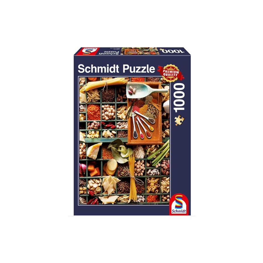 De puzzel Keuken Potpourri bestaat uit 1000 puzzelstukken. Op de afbeelding van deze legpuzzel zie je een verzameling van kruiden, specerijen en pasta's.