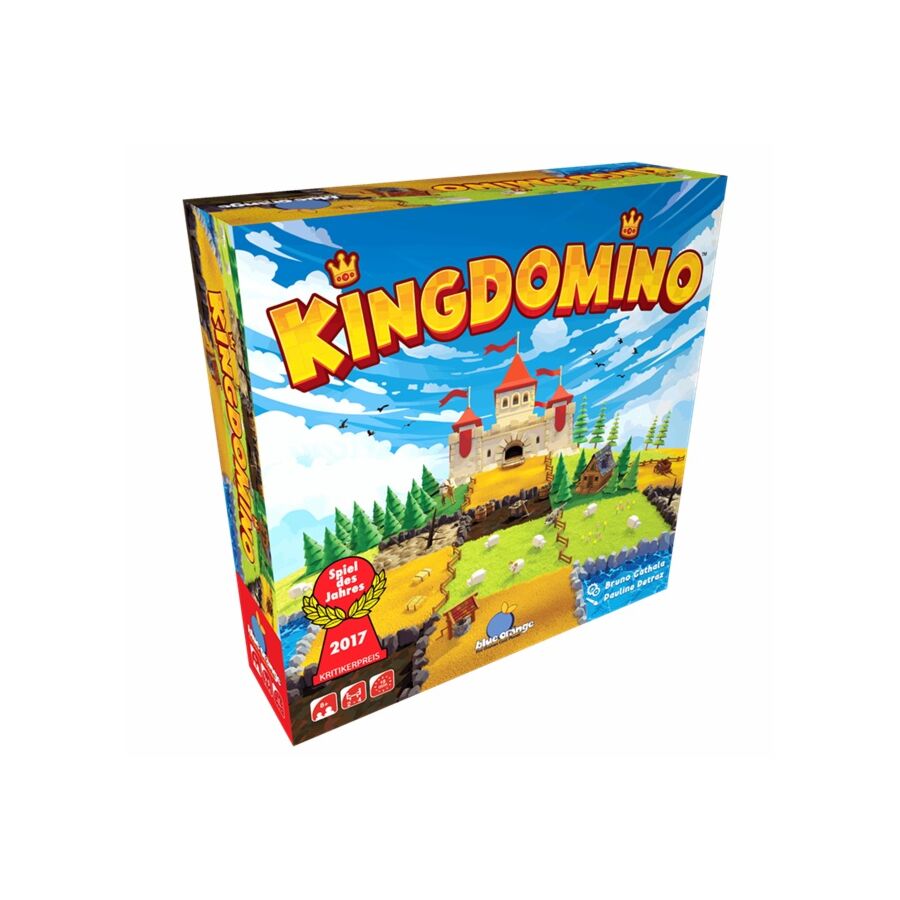 In Kingdomino kiezen de spelers om beurten een dominosteen uit die ze in hun koninkrijk leggen. Hoe groter hun gebied is en hoe meer gebouwen er zich in bevinden, hoe meer punten ze scoren.