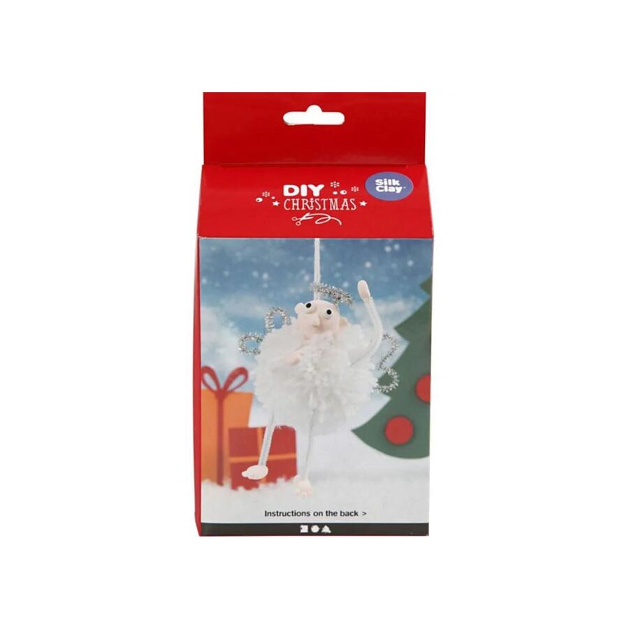 De engelenfiguur heeft een pom-pom lijf, armen en benen van chenilledraad en een hoofd van Silk Clay.
